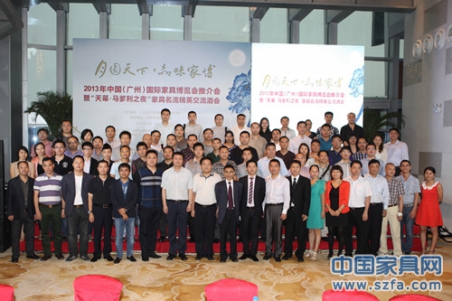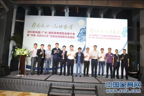 9月24日,2013年中國(廣州)國際家具博覽會推介會暨“天幕·馬爹利之夜”家具名流精英交流酒會在廣交會琶洲威斯汀酒店舉行。本次活動由廣州市020F家具俱樂部主辦,得到了中國(廣州)國際家具博覽會主辦方中國對外貿(mào)易廣州展覽總公司華佳分公司、順德家具品牌聯(lián)盟的大力支持,中國對外貿(mào)易廣州展覽總公司華佳分公司副總經(jīng)理陳旺輝,中國對外貿(mào)易廣州展覽總公司華佳分公司副總經(jīng)理吳佶強(qiáng)、中國家具品牌聯(lián)盟監(jiān)事會主席、康升集團(tuán)總裁劉永康,順德家具品牌聯(lián)盟主席、華倫蒂詩家具有限公司總經(jīng)理周振揚、廣州市020F家具俱樂部執(zhí)行董事莊子標(biāo),以及家具企業(yè)老總、行業(yè)精英、新聞媒體等100多人參加了活動。