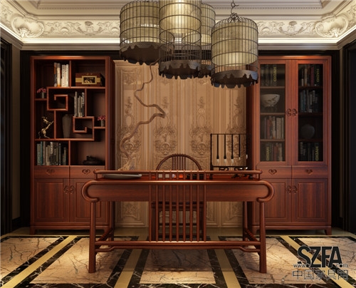 進(jìn)入書房,書臺(tái)書椅簡(jiǎn)約大方,每一個(gè)棱角都細(xì)膩而認(rèn)真,散發(fā)著藝術(shù)文學(xué)的氣質(zhì)。旁邊的書柜安靜而包容,井井有條,一絲不茍,規(guī)矩而不沉悶,精致適宜的花飾以搭配,讓人在書香四溢的書房里思維靈動(dòng)。