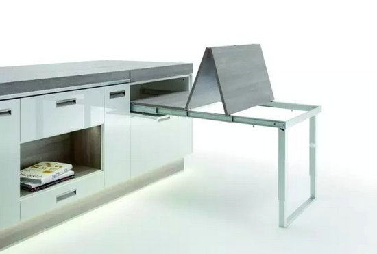 保持整個空間的整潔性是海福樂開放式廚房的設(shè)計初衷,整個廚房在無需使用的時候可以隱藏在門板背后,簡約大方的外觀下隱藏著“亂糟糟”的廚房空間。使用時可以拉開門板,各種廚房餐具應(yīng)有盡有,同時操作臺也可以一邊移動一邊保持使用狀態(tài),烹飪美味佳肴的同時可與家人暢快聊天。Hublift拉伸餐臺讓你在整齊和寬大桌面間自由地?zé)o縫切換:可以將廚房爐灶隱藏起來保持整潔,拉伸出來工作區(qū)或用餐區(qū)一點兒不少, 家里來多幾個客人也不成問題。