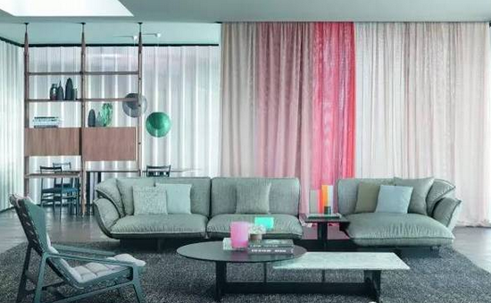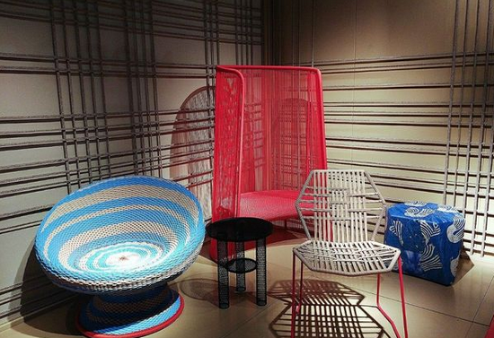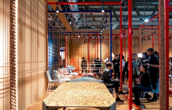▲ Moroso運用線性隔斷突出了戶外產(chǎn)品的編織屬性。作品包括上世紀(jì)60年代復(fù)古皮、V&A椅子,三宅一生的餐桌以及佐藤大的高速公路餐桌等。