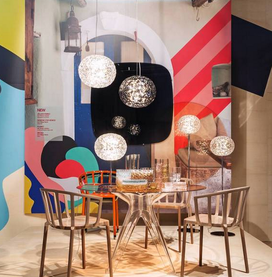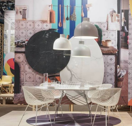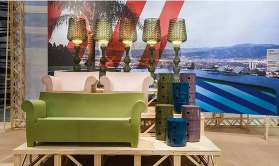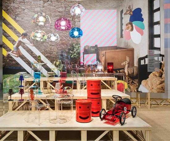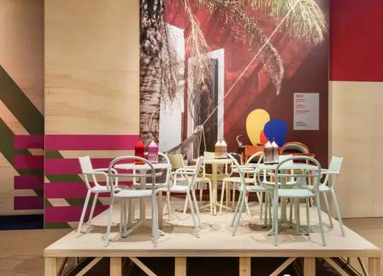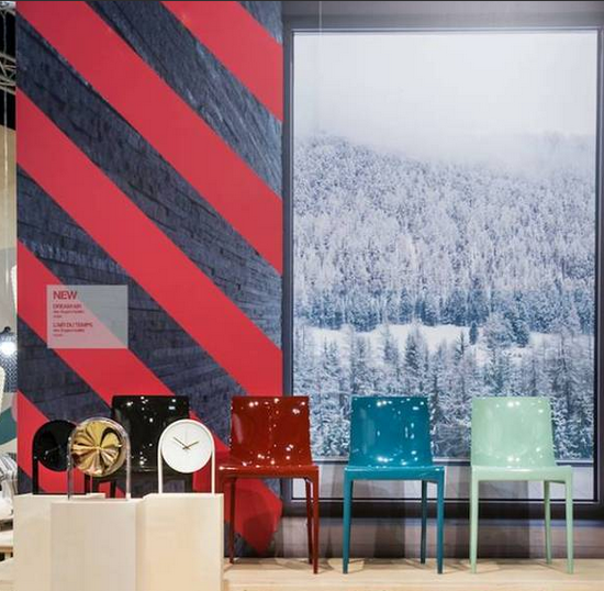 ▲ Kartell展廳利用照片與視覺符號相結(jié)合的平面背景,給前面的產(chǎn)品營造了語境,增強理解與感受。