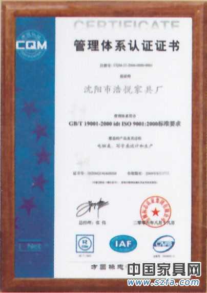 證書介紹 沈陽市浩悅家具廠認(rèn)證書 證書圖片 |