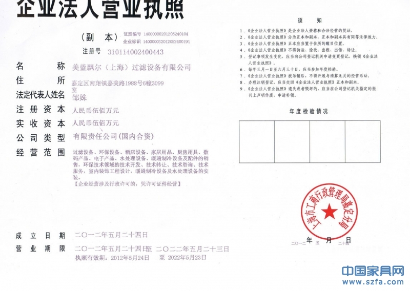 美國藍飄爾營業(yè)執(zhí)照證書