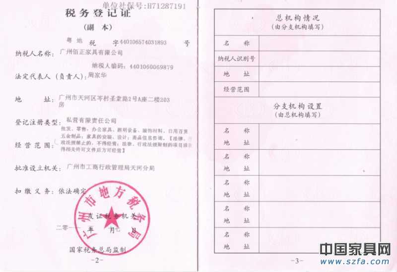 廣州佰正家具有限公司地方稅務登記證
