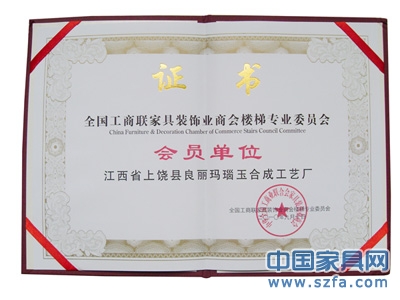 | 發(fā)證機(jī)構(gòu): | 全國工商聯(lián)家具裝飾業(yè)商會樓梯專業(yè)委員會 | 發(fā)證時間 : | 2010-09-10 |