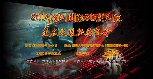 由于我國電影票房的連年大幅增長、國家政策的支持,吸引了眾多投資人及熱錢進入電影行業(yè)。為配合我國電影產(chǎn)業(yè)發(fā)展,讓投資商一站式采購影院先進設(shè)備,由深圳3D影視協(xié)會、勵漢展覽(上海)有限公司主辦的“2016深圳國際3D影劇院技術(shù)及設(shè)施展”于2016年10月12-14日在深圳大中華喜悅會展中心舉行。預(yù)計展覽面積20000平方米,展商300家,觀眾預(yù)計超過3萬人次。
