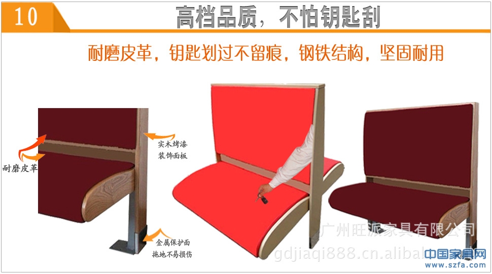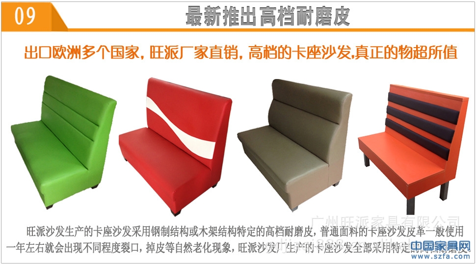 1、最新推出高檔耐磨皮:旺派沙發(fā)生產(chǎn)的卡座沙發(fā)采用鋼制結(jié)構(gòu)或木制結(jié)構(gòu)特定的高檔耐磨皮,普通面料的皮革卡座沙發(fā)皮革一般使用一年左右就會(huì)出現(xiàn)不同程度裂口,掉皮等自然老化現(xiàn)象,旺派沙發(fā)廠生產(chǎn)的卡座沙發(fā)全部采用特定的高檔耐磨皮,經(jīng)驗(yàn)證:用鎖匙刮過后都不會(huì)出現(xiàn)裂口,刮痕,如果您有需要我們可以免費(fèi)為您寄過皮樣色卡,您收到皮樣后您可以同普通皮革作對(duì)比(郵寄費(fèi)由買方支付)