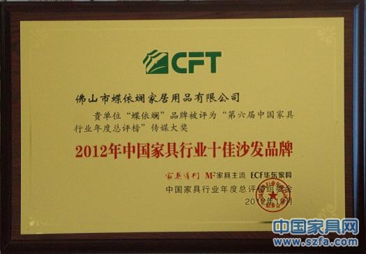 蝶依斕被評為2012年中國家具行業(yè)十佳沙發(fā)品牌