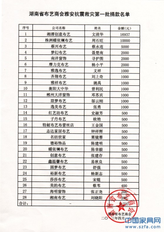 蝶依斕愛心人士參與湖南省布藝商會(huì)組織的雅安抗震救災(zāi)