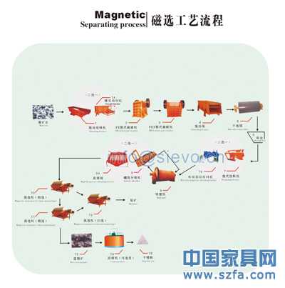 磁鐵礦選礦設(shè)備具體生產(chǎn)流程如下: 開采的礦石先由顎式破碎機進行初步破碎,在破碎至合理細度后經(jīng)由提升機、給礦機均勻送入球磨機,由球磨機對礦石進行粉碎、研磨。經(jīng)過球磨機研磨的礦石細料進入下一道工序—分級。螺旋分級機借助固體顆粒的比重不同而在液體中沉淀的速度不同的原理,對礦石混合物進行洗凈和分級。經(jīng)過洗凈和分級的礦物混合料在經(jīng)過磁選機時,由于各種礦物的比磁化系數(shù)不同,經(jīng)由磁力和機械力將混合料中的磁性物質(zhì)分離開來。 經(jīng)過磁選機初步分離后的礦物顆粒在被送入浮選機,根據(jù)不同的礦物特性加入不同的藥物,使得所要的礦物質(zhì)與其他物質(zhì)分離開。在所要的礦物質(zhì)被分離出來后,因其含有大量水分,須經(jīng)濃縮機的初步濃縮,再經(jīng)烘干機烘干,即可得到干燥的礦物質(zhì)。
