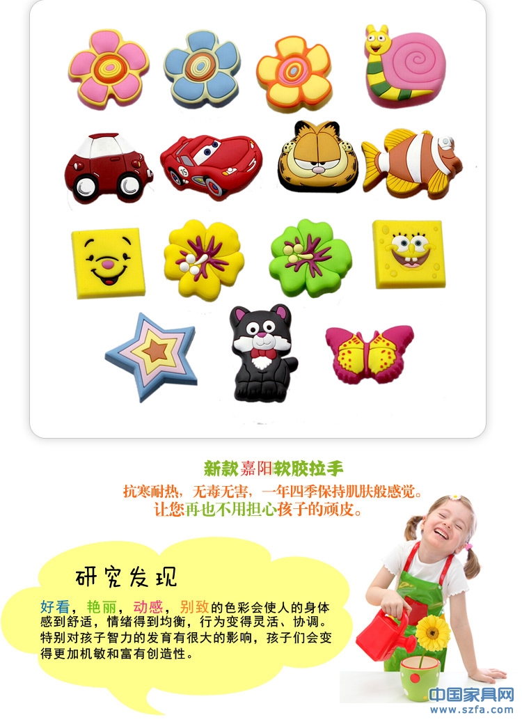 新款嘉陽軟膠拉手,抗寒耐熱,無毒無害,一年四季保持肌膚般感覺,讓您再也不用擔(dān)心孩子的頑皮。研究發(fā)現(xiàn),好看,艷麗,動感,別到致的色彩會使人的身體感到舒適,情緒得到均衡,行為變得靈活,協(xié)調(diào)。特別對孩子智力的發(fā)育有很大的影響,孩子會變得更加機敏和富有創(chuàng)造性!