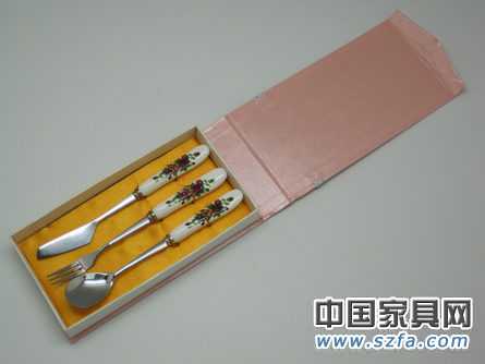 叉勺選用食品級不銹鋼精制而成,手柄陶瓷為白玉強(qiáng)化瓷,盒內(nèi)墊海綿絲巾布材料,餐具用金絲松緊帶固定,盒子為1000克灰板紙手工制作,盒子表面裱有特種紙,可印刷、可燙印指定的LOGO,陶瓷柄圖案有多種供客戶挑選,更可以定制。