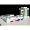 在此系列展柜中更加注明光色的搭配,比如說黃金飾品可以采用冷光杯進行照明,而銀制品或者寶石類的產(chǎn)品可以采用日光杯進行照明,因有熱量的產(chǎn)生,需考慮展柜的散熱因素的處理,化妝品包裝大部分是以白色為主,在燈光下,更顯美白純凈之感。