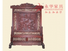 【商品詳細描述】:此十八學士屏風通體為大紅酸枝。其頂端浮雕蝙蝠紋、龍紋,寓意富貴吉祥。屏風中部嵌板芯,浮雕十八學士圖紋,其兩側(cè)鏤雕草龍紋,其上下格面鏤雕雙龍捧壽紋,栩栩如生,惟妙惟肖。牙板浮雕草龍紋。造型豐盈,雕工精致,節(jié)奏疏密有致,在華美中溢著空靈淡雅之韻。