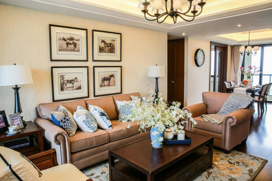 軟裝過程中,色彩搭配決定了居室整體氣質(zhì)。美式風(fēng)格傾向于沉穩(wěn)的濃色,如咖啡色、深桃花芯色,來奠定優(yōu)雅基調(diào)。對中小戶型而言,設(shè)計師點綴藍(lán)、白、綠、黃、粉等活力色彩,利用靠墊、擺件、花瓶等潮流單品,中和家具基調(diào),能為中小空間帶來一份輕盈。