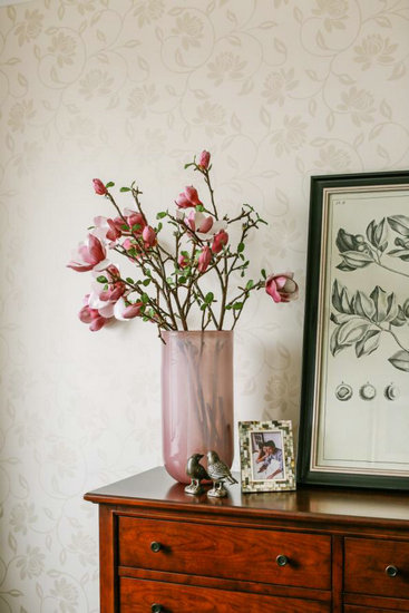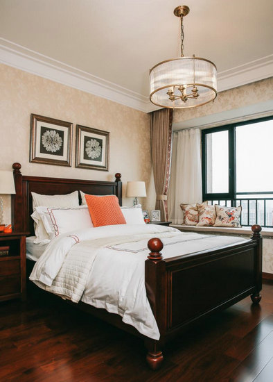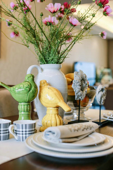 在基調(diào)沉穩(wěn)的餐廳以及臥室中,色彩鮮艷的仿真綠植及黃色、綠色小鳥擺件,緩和了美式家具的“濃妝”,為空間融入些許海洋、自然原野的風(fēng)味,更添趣味性。