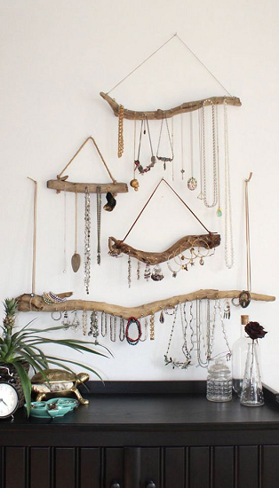 小姑娘總是有買(mǎi)不完的首飾,沒(méi)個(gè)專門(mén)收納的地方真的不行,尤其是項(xiàng)鏈?zhǔn)宙溸@種東西,堆在一起肯定會(huì)纏成一坨……掛起來(lái)吧!樹(shù)枝做的首飾架,還有那么幾分自然風(fēng)情呢~