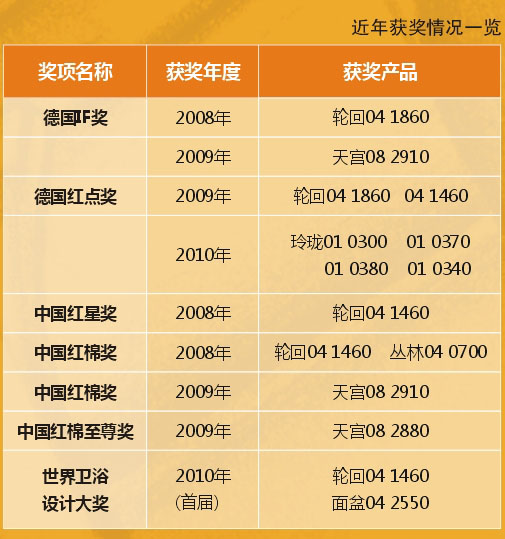 2010年3月初,安蒙衛(wèi)浴再一次成為了行業(yè)的焦點,安蒙衛(wèi)浴“玲瓏”系列四款產(chǎn)品同時榮獲德國紅點大獎。而這一切都出自中國的原創(chuàng)設(shè)計,見證了民族品牌在世界設(shè)計領(lǐng)域的崛起,向世人昭示國內(nèi)衛(wèi)浴行業(yè)蓬勃的創(chuàng)新力量與發(fā)展遠景。
