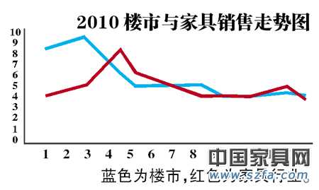 2010年4月17日與9月29日,國家為了遏制房價過快上漲,相繼出臺兩輪調(diào)控政策,豈料樓市價格青云直上。處于房地產(chǎn)行業(yè)下游的家居行業(yè)不得不遭受牽連。不過,家具、家紡、餐廚用品、裝修裝飾等在內(nèi)的行業(yè)會有2~3個月的滯后期,所以,2010年的五一長假,廠商依然能賺個盆滿缽滿。其后,市場陷入慘淡期。