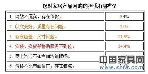 日前記者圍繞“消費(fèi)者對(duì)家居產(chǎn)品網(wǎng)購(gòu)的擔(dān)憂(yōu)有哪些”這一主題,就終端消費(fèi)者的投訴問(wèn)題展開(kāi)了一次廣泛的網(wǎng)絡(luò)調(diào)查活動(dòng)。其中,選擇“安裝、換貨等售后服務(wù)不到位”的人數(shù)占 34.4%,選擇“以次充好、質(zhì)量存在問(wèn)題”的占25%,選擇“存在色差、尺寸問(wèn)題”的占21.9%,這些是家居行業(yè)網(wǎng)銷(xiāo)存在的主要問(wèn)題。除了這三大問(wèn)題之外,在終端消費(fèi)市場(chǎng),還存在諸如“網(wǎng)上溝通不如當(dāng)面溝通順暢”、“價(jià)格存在貓膩,不比市面便宜”、“網(wǎng)站不屬實(shí),存在假貨”等方面的問(wèn)題。正是這些不利因素,促成了部分消費(fèi)者對(duì)家居網(wǎng)購(gòu)認(rèn)可度不高的印象。