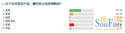 作為家居中最成熟的產(chǎn)業(yè),家電網(wǎng)購已經(jīng)處于成熟階段,無論是官網(wǎng)還是淘寶網(wǎng),品牌家電基本都投入到網(wǎng)銷的洪流中。在此次調(diào)查中,當被問及聽會選擇哪些家居產(chǎn)品網(wǎng)購時,家電毫無疑問地以“47.2%”的高比例占據(jù)首位,而軟裝和家具分別以“19.4%”和“16.7%”的接近比例位列第二和第三。在眾多家居產(chǎn)品中,相對家電網(wǎng)購的成熟,家具網(wǎng)購可以說還處于發(fā)展階段,但是可以預(yù)見是未來的趨勢之一.
