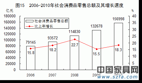 全年社會(huì)消費(fèi)品零售總額156998億元,比上年增長18.3%,扣除價(jià)格因素,實(shí)際增長14.8%。按經(jīng)營地統(tǒng)計(jì)[8],城鎮(zhèn)消費(fèi)品零售額136123億元,增長18.7%;鄉(xiāng)村消費(fèi)品零售額20875億元,增長16.2%。按消費(fèi)形態(tài)統(tǒng)計(jì),商品零售額139350億元,增長18.4%;餐飲收入額17648億元,增長18.1%。