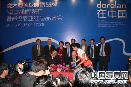 Dorelan與雅露斯的戰(zhàn)略合作被譽為2011年家具行業(yè)的“國際聯(lián)姻”,成為了第26屆深圳國際家具展的新亮點,為深圳乃至中國家具產(chǎn)業(yè)升級做了新探索。這場“國際聯(lián)姻”在意大利駐華使館對外貿(mào)易委員會首席代表保羅-列馬(Paolo Lemma)、中國家具協(xié)會秘書長張冰冰、深圳家具行業(yè)協(xié)會秘書長侯克鵬、中國工商聯(lián)家居裝飾業(yè)協(xié)會會長、月星集團董事長兼總裁丁佐宏、中國銷售商聯(lián)合會輪值會長曾震宇、紅星美凱龍集團副總裁車建芳、居然之家董事長汪林鵬、歐亞達董事長徐良喜、喜臨門總裁許驚鴻、吉盛偉邦董事長鄒文龍、意大利dorelan創(chuàng)始人Tura Diano和Piero Bergamaschi、雅露斯家具董事長鄭智敏等行業(yè)著名人士的見證下,dorelan行政總監(jiān)Ricardo與雅露斯總經(jīng)理劉德桂雙方高層成功簽約并交換合同。