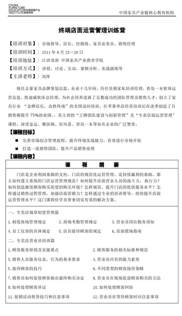 核心提示:2011年8月終端店面運(yùn)營管理訓(xùn)練營圖片,多多學(xué)習(xí)不斷提高自己,才能把握家具行業(yè)未來的走勢(shì)和趨向。