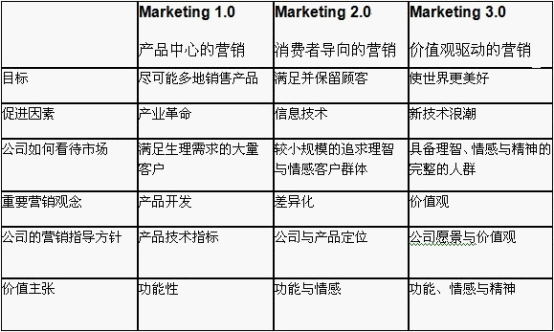 營銷1.0、2.0、3.0之比較(引自《營銷3.0:價值觀驅(qū)動的營銷》,菲利普??铺乩?/font>)