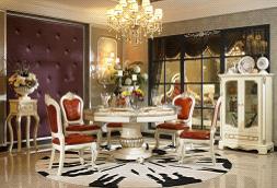 轉(zhuǎn)過去,又是一番風(fēng)景,這個(gè)系列的組合以紅色基調(diào)為主,熱情奔放,高貴時(shí)尚,這張大氣的大理石餐桌配上幾把紅色真皮餐椅,桌上擺放的紅酒、高腳杯、果盤恰到好處,淡黃色的燈光和黑白相間的圓地毯為這個(gè)餐廳增添了幾分亮麗色彩,這一切猶如是在等待一位美麗的女主人的到來??繅叺陌咨驴罹乒裾宫F(xiàn)它特有的風(fēng)采,帶銀箔的線條,細(xì)膩而柔和,對(duì)面的花架呈現(xiàn)曲線美,紫色的背景墻布帶來了幾分暖意。整個(gè)大廳是一幅畫,傳承了中國文化,盡顯法式風(fēng)采,浪漫,陽光而明媚。
