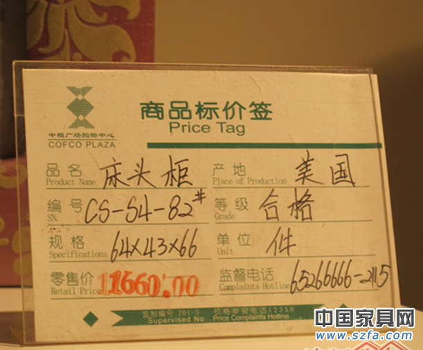 根據(jù)《上海家具行業(yè)產(chǎn)品三包責(zé)任規(guī)則》指出:標(biāo)價(jià)應(yīng)有中文標(biāo)明產(chǎn)品名稱(chēng)、型號(hào)、產(chǎn)地、廠名、經(jīng)銷(xiāo)商或進(jìn)口代理商名、等級(jí)、計(jì)價(jià)單位、規(guī)格、基輔料等標(biāo)識(shí)。但記者發(fā)現(xiàn)中糧廣場(chǎng)入駐進(jìn)口品牌中天龍八部,大部分標(biāo)簽上只有品名、產(chǎn)地、編號(hào)、等級(jí)、規(guī)格、單位、零售價(jià)、監(jiān)督電話這八項(xiàng)。其中,少部分商家用黑色鉛字筆在標(biāo)簽右上方手寫(xiě)標(biāo)明材質(zhì)。