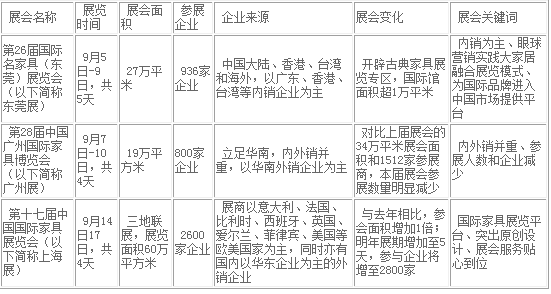 通過這個表格的信息,我們可以明顯看出三大展會之間的趨同和變化。上海展立足華東,以外銷和引進國際品牌為主,這點與廣東家具展的“內(nèi)外銷并重”的理念實則一致。同時,今年東莞家具展擴大國際館面積至1萬平方米,加大國際品牌在展會上的呈現(xiàn)力度。三個展會不約而同地將家具的國內(nèi)外品牌放在同一個平臺展示,由此說明國際品牌進入中國市場的愿望和趨勢,同時中國市場變身“世界市場”的趨勢也在加劇,中國家具行業(yè)面臨的競爭也將日趨激烈。
