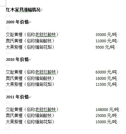 從國內(nèi)某知名紅木家具生廠商提供的原材料價(jià)格清單來看,從2009年至2011年,各類紅木家具的原材料成本較之過去呈現(xiàn)翻倍增長趨勢。根據(jù)清單顯示:老撾紅酸枝2009年價(jià)格僅為35000元/噸,2010年翻番價(jià)格上升為63000元/噸,2011年9月份又在2010年基礎(chǔ)上翻番,成交價(jià)為148000元/噸;緬甸酸枝則在2009年的11000元/噸,價(jià)格飛漲到如今的25000元/噸;就連紅木家具中較為便宜的緬甸花梨,價(jià)格也從2009年的9500/噸上漲到目前的15000元/噸。