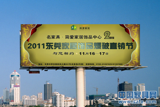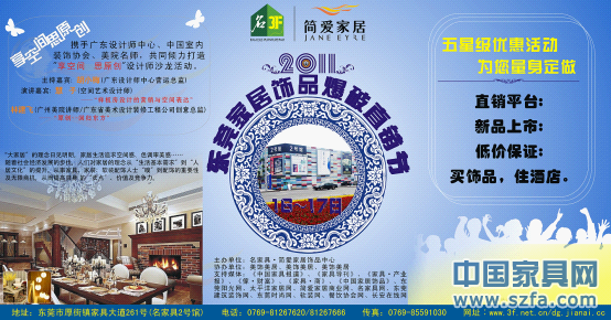 名家具•簡愛家居飾品中心在宣傳推廣中倡導(dǎo)生活新概念,同時也注重各大品牌的發(fā)展,加強珠江三角地區(qū)設(shè)計師及家具工廠、家飾/家具行業(yè)經(jīng)銷商、高端消費群體等對商場的認知度;搭建一個除展覽會以外的展銷交流平臺,建立與工廠代表進行點對點的交流,實現(xiàn)相互間的有效聯(lián)動,特舉辦“2011東莞家居飾品爆破直銷節(jié)”誠邀您的光臨,歡迎指導(dǎo)、洽談!