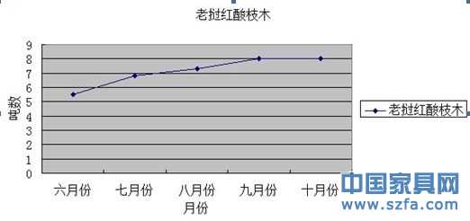 對(duì)比九月份、十月份的數(shù)據(jù)——紅酸枝木的價(jià)格一直在平穩(wěn)的一個(gè)區(qū)間內(nèi),未隨客戶需求量在不斷變化,小料供過(guò)于求,有小幅跌價(jià)之說(shuō),市場(chǎng)成交價(jià)格依然維持前期價(jià)位的現(xiàn)象。