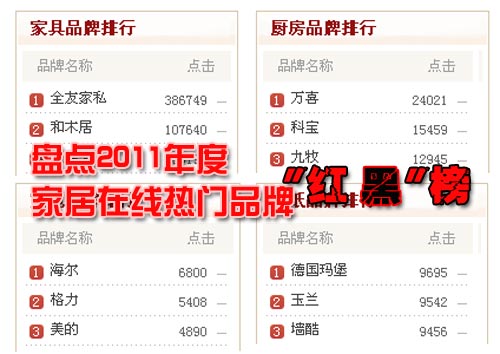 古語云,以人為鏡,可以知得失。 以己為鏡,可以知吉兇。2011年即將過去,在翻開2012新篇章之前。讓我們一起來回顧家居業(yè)在2011年的得與失。小編以家居紅黑榜的形式,盤點家居 在線網(wǎng)站熱門品牌。“紅榜”均為穩(wěn)坐家居在線網(wǎng)站榜首品牌,“黑榜”涉及品牌均為因產(chǎn)品質(zhì)量或售后被工商部門或媒體曝光品牌。