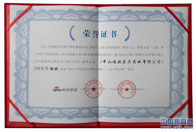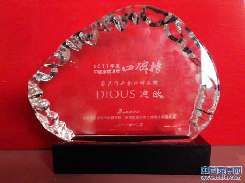 12月11日,由新浪家居主辦,中國消費者協(xié)會、中國建筑材料流通協(xié)會指導(dǎo)的“2011中國家居及房產(chǎn)配套產(chǎn)業(yè)創(chuàng)新峰會暨口碑榜頒獎盛典”在北京鉑爾曼大飯店隆重舉行。迪歐家具榮獲“2011中國家居消費口碑榜金口碑品牌”盛譽,成為中國辦公家具行業(yè)獲得“消費金口碑品牌”獎項的少數(shù)品牌之一。
