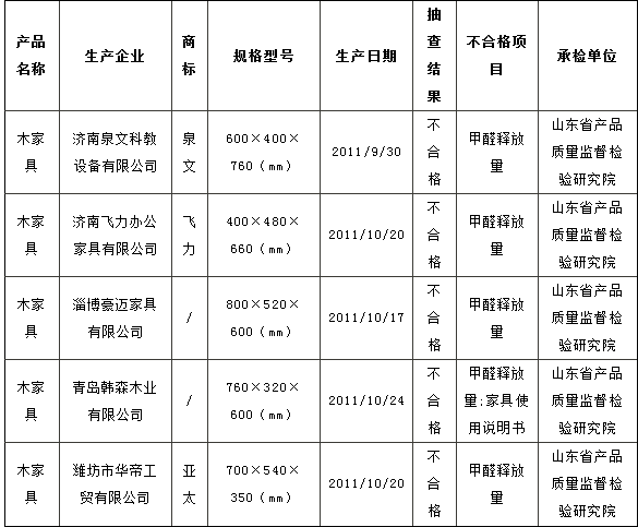 抽查發(fā)現(xiàn)5批次產(chǎn)品甲醛釋放量項(xiàng)目不合格,涉及濟(jì)南泉文科教設(shè)備有限公司、濟(jì)南飛力辦公家具有限公司、淄博豪邁家具有限公司、青島韓森木業(yè)有限公司、濰坊市華帝工貿(mào)有限公司等5家企業(yè)。個(gè)別產(chǎn)品還檢出家具使用說(shuō)明書(shū)項(xiàng)目不合格。