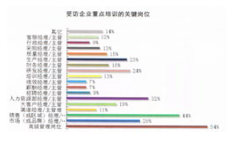 54%的企業(yè)將“高級管理崗位”作為企業(yè)重點培訓(xùn)的關(guān)鍵崗位,“銷售經(jīng)理”以44%位居專職崗位第一,“生產(chǎn)、研發(fā)、人力資源、財務(wù)、市場”等皆屬于企業(yè)重點培訓(xùn)的關(guān)鍵。