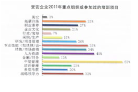 2011年有62%的企業(yè)重點組織過“中層管理”的培訓(xùn)項目,這與中層管理者是企業(yè)培訓(xùn)預(yù)算最多的群體保持一致。此外,“銷售、人力資源、戰(zhàn)略領(lǐng)導(dǎo)力、專業(yè)技能、拓展訓(xùn)練”的培訓(xùn)項目也成為2011年企業(yè)的重點培訓(xùn)項目。
