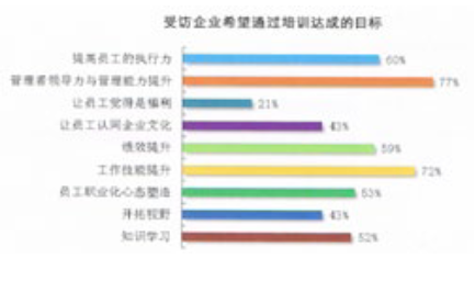 企業(yè)希望通過培訓(xùn)達成的目標(biāo)整體以學(xué)員的能力提高和績效提升為核心,也有43%的企業(yè)希望通過培訓(xùn)讓員工認(rèn)同企業(yè)的文化,有21%的企業(yè)將培訓(xùn)定義為員工福利。