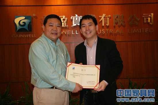 美盈實業(yè)總裁黎偉良先生(左)親自為符凱先生(右)傳授聘書