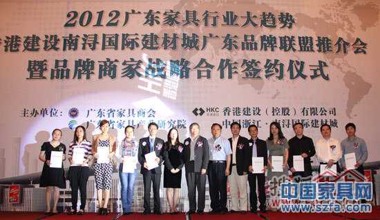 核心提示:4月13日,廣東省家具品牌商迎來了家具行業(yè)2012年的“春天”。由廣東省家具商會和香港建設(shè)旗下浙江湖州南潯國際建材城主辦的“2012廣東家具行業(yè)大趨勢暨香港建設(shè)南潯國際建材城廣東品牌聯(lián)盟推介會”在廣州東莞喜來登大酒店隆重舉行。廣東百余家家具品牌商齊聚一堂,數(shù)10家品牌商當(dāng)場和南潯國際建材城簽訂戰(zhàn)略合作聯(lián)盟,組團北上華東,謀求大發(fā)展。