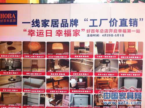好百年家居賣場早在五一節(jié)前夕就早早開始宣傳其“一線家具品牌工廠價”直銷活動,而在5月1日,記者來到好百年家居發(fā)現(xiàn),這次“工廠價”活動還是以低價折扣為主,涉及包括慕思,華源軒,七彩人生,紅蘋果等多家知名家具品牌,不管從力度和范圍上,都稱得上“勁爆”。而除了門口處醒目的標(biāo)語之外,好百年家居賣場內(nèi)部也是“精彩紛呈”。從健威家具的“黃金周送黃金”到滿場跑的舒達(dá)小羊,就連一向甚少做活動的芝華仕都搬出了“歌舞秀”,可見商家們對于這個黃金周的重視程度。