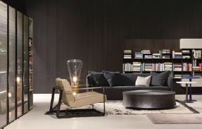 Poliform的新款茶幾均為金屬,使用了深色木紋色與客廳產(chǎn)品進行配套。圖中的這款圓形茶幾直接采用了木樁造型,面板上凹凸有致的仿木紋機理成為最大的亮點。這一做法超越了板式套房家具的一貫作風,儼然是雕塑藝術(shù)和師從自然思想在家具設(shè)計上的運用。