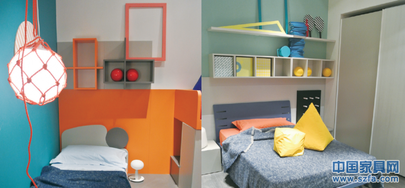 國(guó)外的兒童家具設(shè)計(jì)沒(méi)有嚴(yán)格的風(fēng)格界定,跟國(guó)內(nèi)相比不會(huì)那么具象,更多的是用一種純熟的配色手法去駕馭空間的動(dòng)態(tài),Nonamolibi今年推出的用幾何圖案——圓形、方塊、三角形的組合變換來(lái)來(lái)表達(dá)空間的動(dòng)感和時(shí)尚。從平面到立體來(lái)演繹動(dòng)感和諧,從墻上的三角尺、相框、球到床上的軟包飾品再到地上的三角地毯色塊,使得整個(gè)空間渾然一體,這樣的表達(dá)方式顯得更加成熟,一直能陪伴兒童渡過(guò)不同的時(shí)期直到長(zhǎng)大成人。