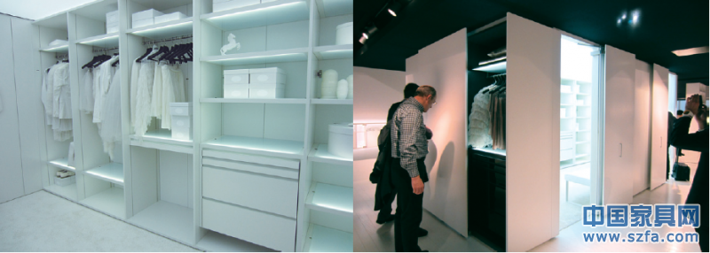 動(dòng)態(tài)二:LED照明的廣泛應(yīng)用Interlubke的步入衣帽間非常搶眼,今年在此展館中單獨(dú)隔出的步入式衣帽間,四面都是封閉式的衣柜,內(nèi)部為開放式的衣柜,除了儲(chǔ)物功能異常強(qiáng)大外,LED照明技術(shù)也被廣泛應(yīng)用了進(jìn)來。頂部采用軟膜構(gòu)筑了面狀光源,層板內(nèi)部采用LED燈帶構(gòu)成線型光源,上下呼應(yīng)的光學(xué)效應(yīng)讓整個(gè)步入室衣帽間給人更加豪華高檔的氣息,配以純白的地毯讓人剛踏入這個(gè)空間就充滿了舒服愜意的居家感受。