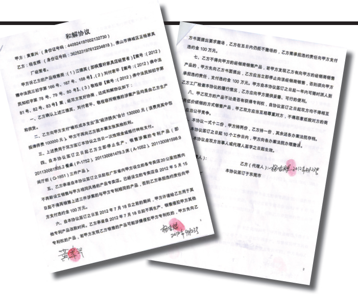 “在互聯(lián)網(wǎng)時代,專利競爭會與網(wǎng)絡(luò)創(chuàng)新一樣出名。”英國《經(jīng)濟(jì)學(xué)人》雜志在今年年初曾作出這樣的斷語。家具專利戰(zhàn)爭,方興未艾。2012年4月23日,廣東省佛山市中級人民法院就東莞市豪興家具有限公司董事長黃章興——甲方訴楊吉輝(佛山市禪城區(qū)正揚(yáng)家具廠經(jīng)營者)——乙方、乙方的產(chǎn)品銷售商江德英(即楓雪軒家具店經(jīng)營者)、劉付君平、敬桂榮專利產(chǎn)品侵權(quán)案進(jìn)行庭外調(diào)解,引起業(yè)界廣泛的關(guān)注。