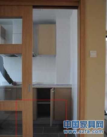 在現(xiàn)場記者發(fā)現(xiàn),廚房一進門放置冰箱的位置,長寬都不超過100CM,如果按照設計圖紙在廚房門口擺放一臺電冰箱,冰箱左側的櫥柜門,打開就要被冰箱阻擋。同樣冰箱右側的半扇廚房門也要受到阻擋。“現(xiàn)在市場上,基本找不到寬度小于40CM的小冰箱,買個對開門的大冰箱,完全放不進廚房。”王先生稱。