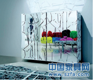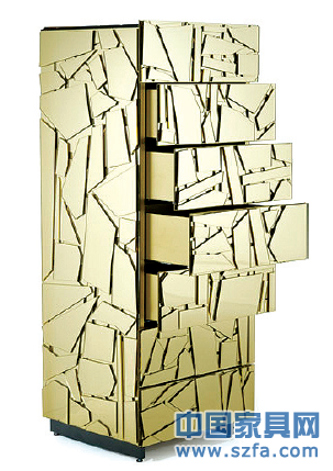 來(lái)自巴西的兄弟設(shè)計(jì)師FernandoCampana及HumbertoCampana,意大行創(chuàng)意家具品牌Edra了一系列名Scrigno的儲(chǔ)物柜。以傳統(tǒng)的方正設(shè)計(jì)為外觀,以木夾板為結(jié)構(gòu)基礎(chǔ),在表面涂上Edra專用的金屬顏料,再以意形的鏡面壓克力布滿在儲(chǔ)物柜之上,任由鏡面一樣的表面把光線及形象反射,使Srigno變得閃閃生輝。